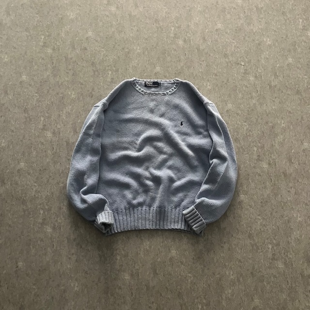 Polo Ralph Lauren cotton knit sweater size XL 肩幅 55㎝ 身幅 63.5㎝ 着丈 63㎝ 袖丈 67㎝ こりゃ出ました!!! ラルフからアイスブルーカラーのコットンニット◎◎ しっかりoldタイプのガシガシコットン生地なところも最高!! オススメすぎます!! 【condition】 全体的に使用感、シミがございます。