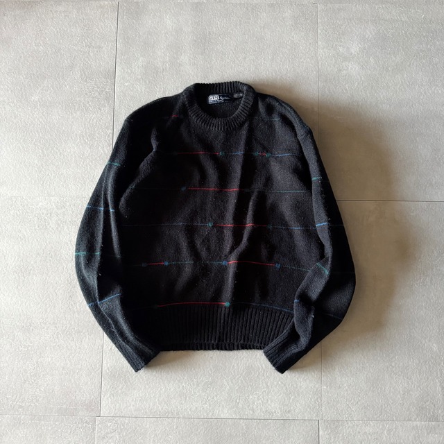 80's Sim sports wear Acryl knit size XL 肩幅 50㎝ 身幅 54㎝ 着丈 60㎝ 袖丈 60㎝ ブラックベースにボーダー調の柄が入る オシャレなアクリルニット!! ブラックカラーなので使い勝手も良く、 やり過ぎてないこのくらいの柄で探されている方も多いかなと◎◎ 今時期はインナー,春先は一枚で是非!! 【condition】 全体的に使用感がございます。