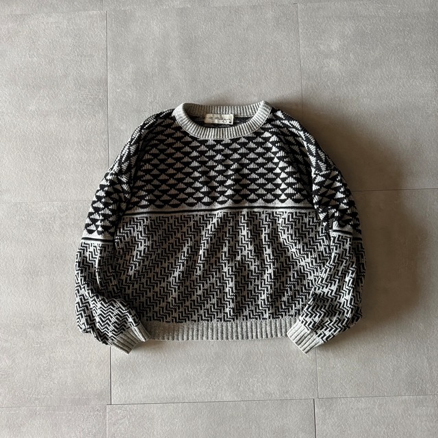 80's〜 Mr. Montagne Acryl knit size M made in Italy 肩幅 71㎝ 身幅 60㎝ 着丈 56㎝ 袖丈 52㎝ イタリアンメイドの小洒落たニット◎◎ よくみると上下で切り替えのあるパターン。 袖にもそのディティールが入ってるのが 中々に面白いかなと。 サイズバランスもgoodです!! 【condition】 全体的に使用感がございます。