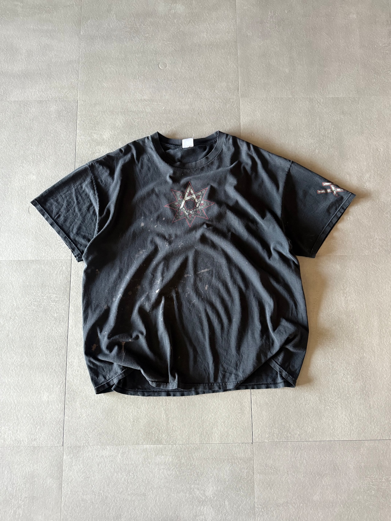 フロント八芒星のプリント、バックプリントにはナンバリング入りの一風変わったバンドtee。
