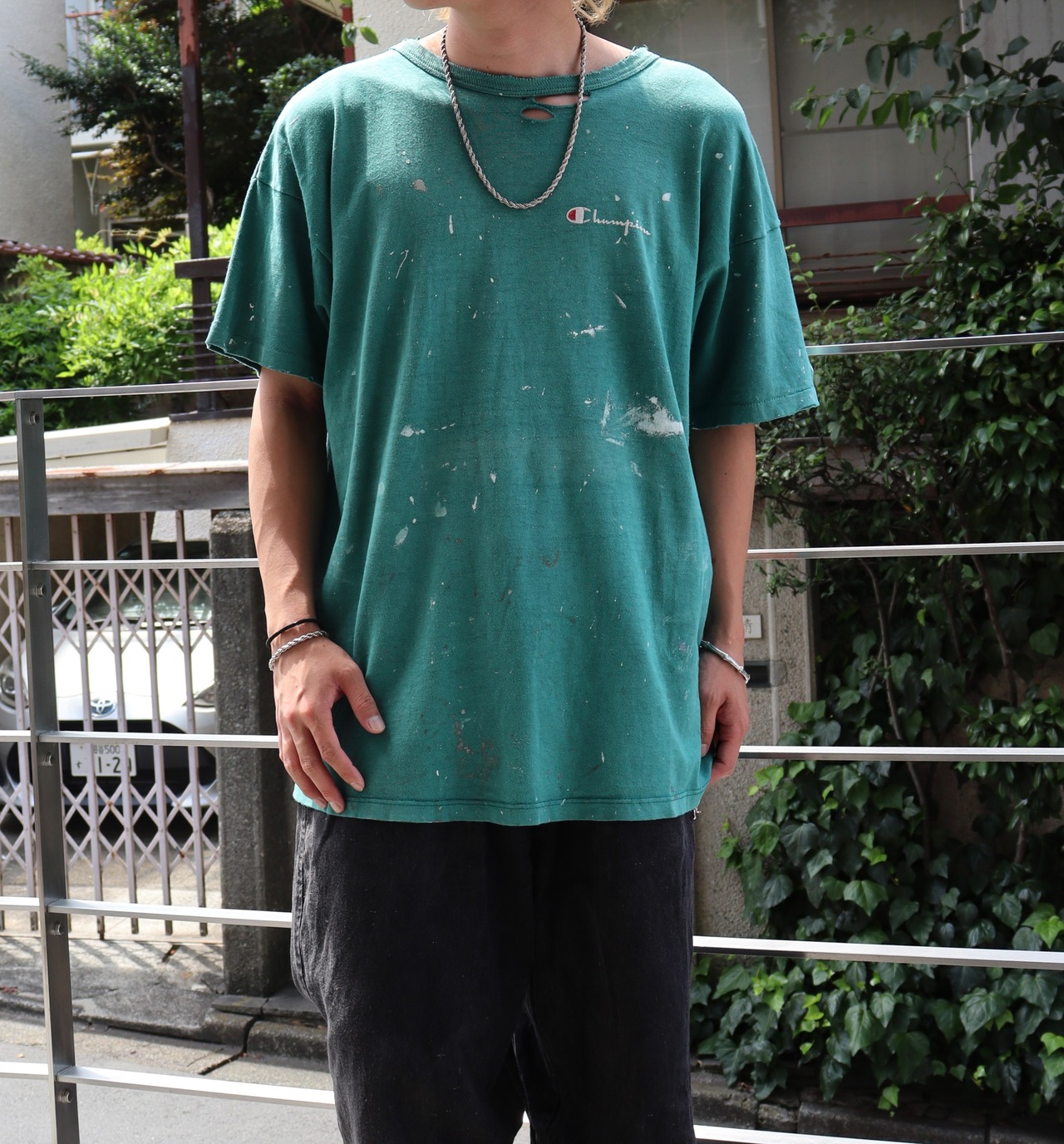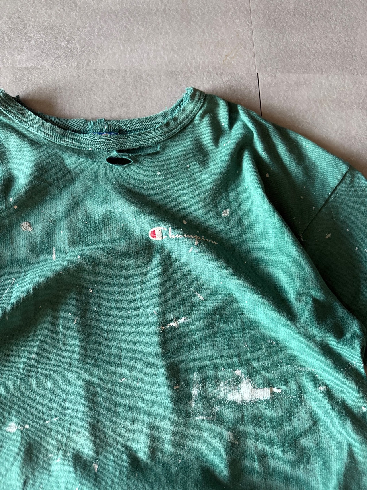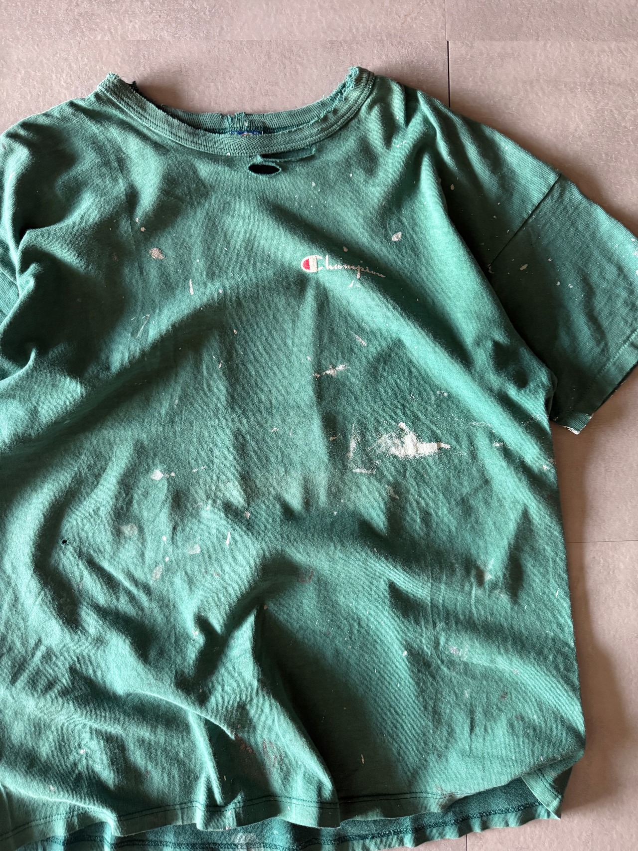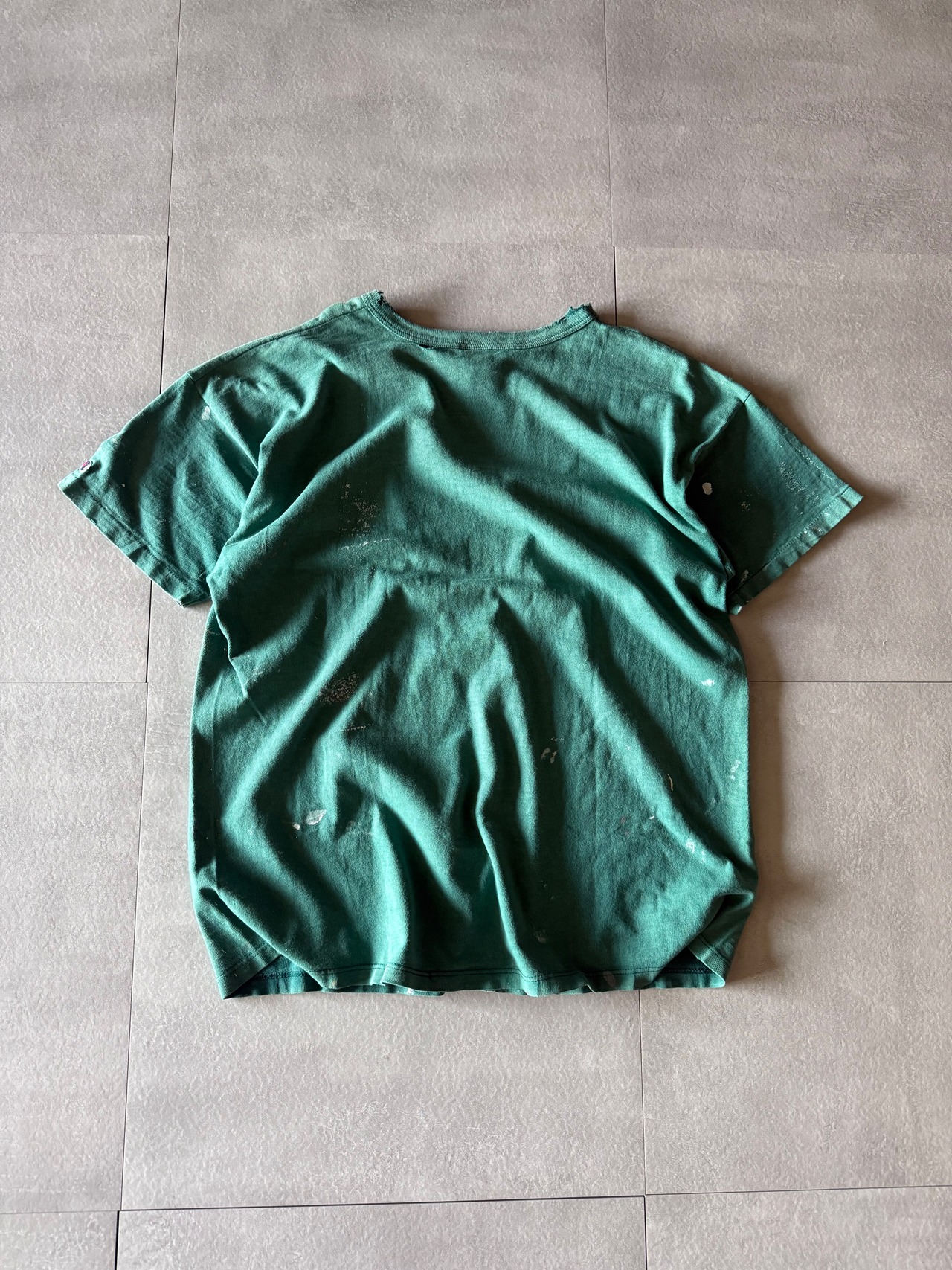 ペンキも飛んでるわ、破けてるわ、色は抜けてるわ、ななんとも古着らしいtee。