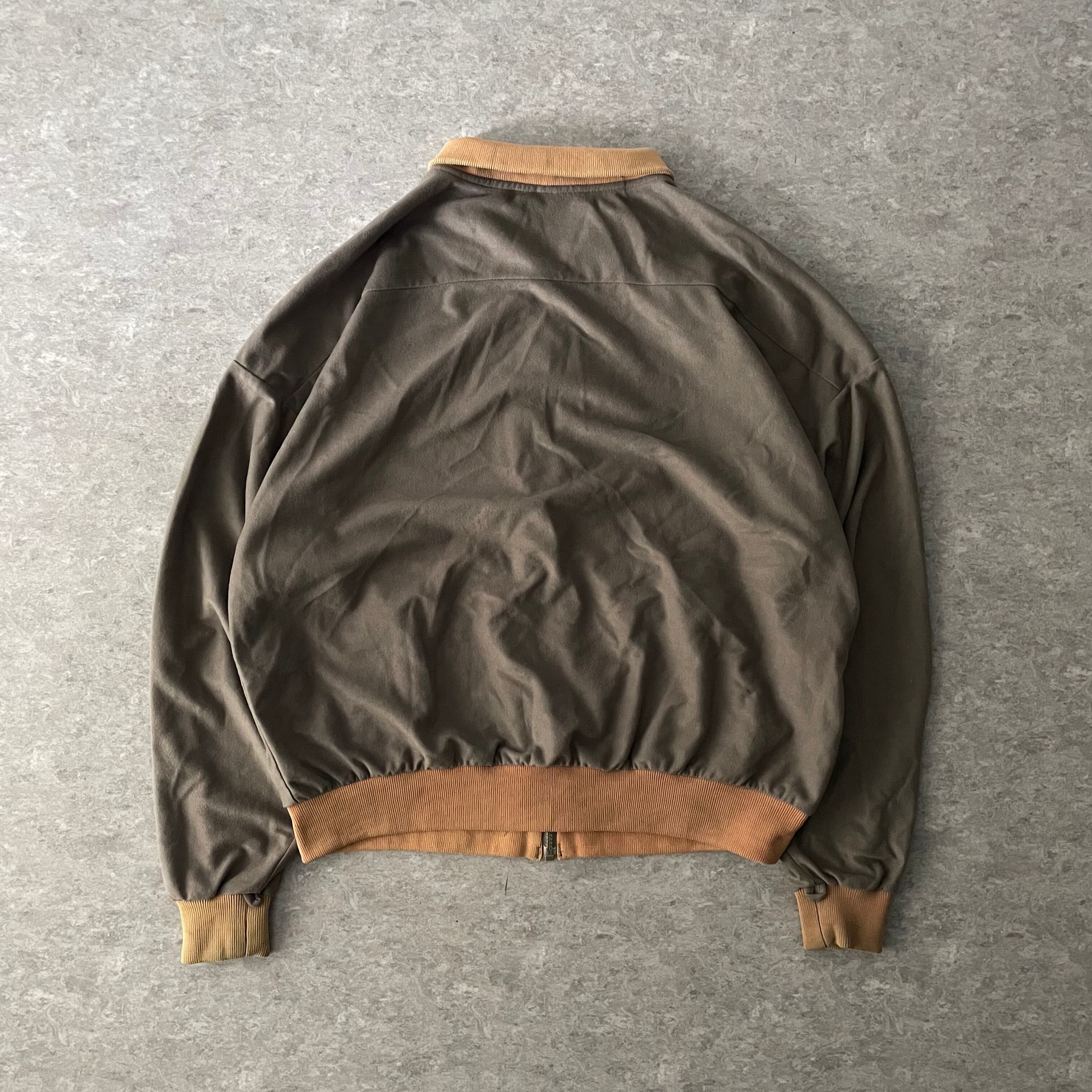 カーキ色のベロアにベージュのリブ、 ショールカラー。